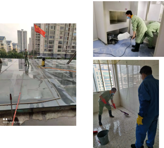 项目部组织员工加班加点“分工不分家”、协同作战,除了日常保洁外,还定期对医院的各处地板进行了高压清洗,保持洁净。
