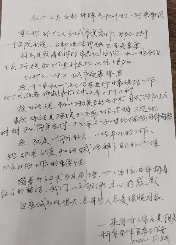 9月8日,朗洁泉州第一医院城东院区项目上收到了一封来自介入室及其相关科室全体医护人员手写的表扬信。信中对保洁大姐吴秋叶女士的工作给予肯定与赞扬,并表达了由衷的感谢。